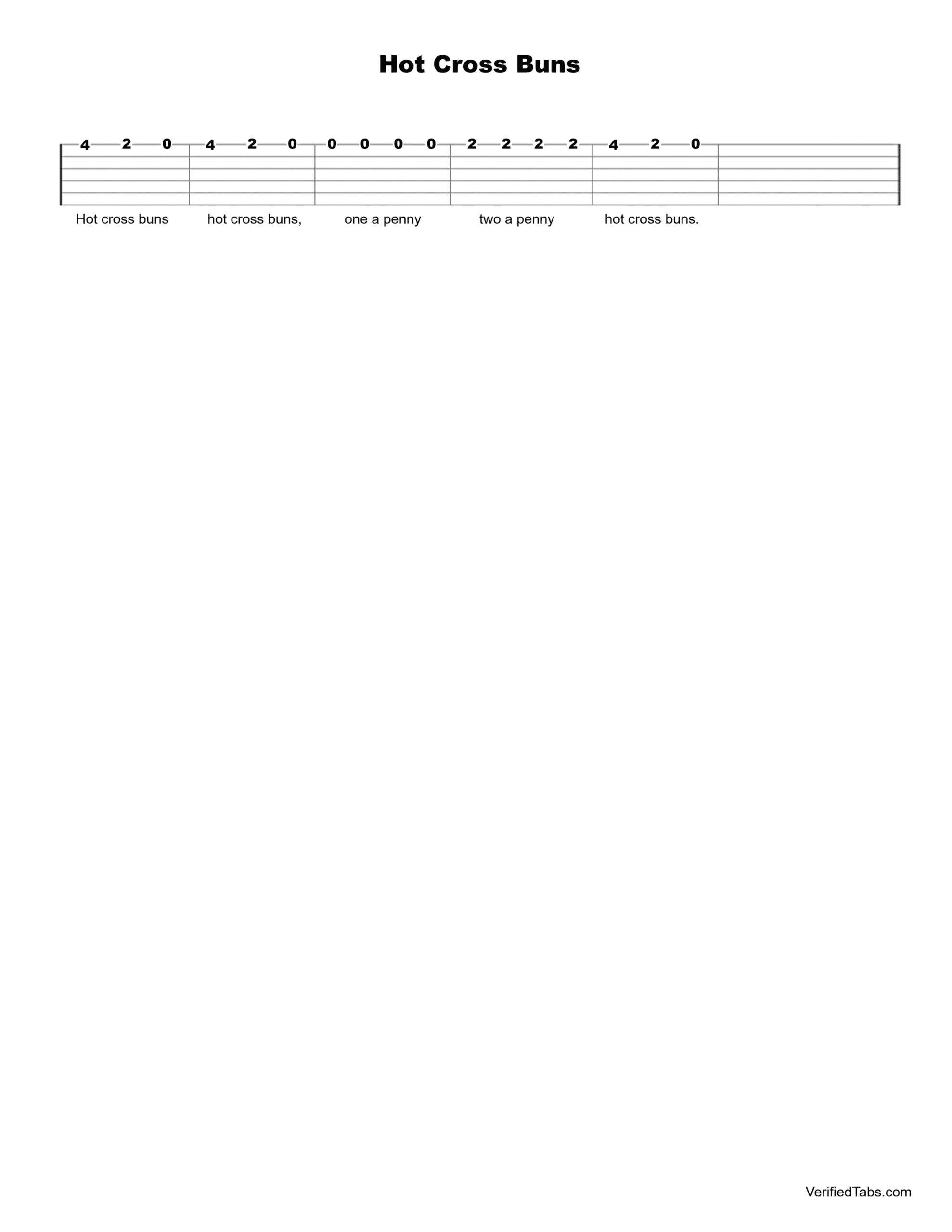 How to play Hot Cross Buns guitar tab with lyrics. Browse more from Easy Songs or Popular Songs.