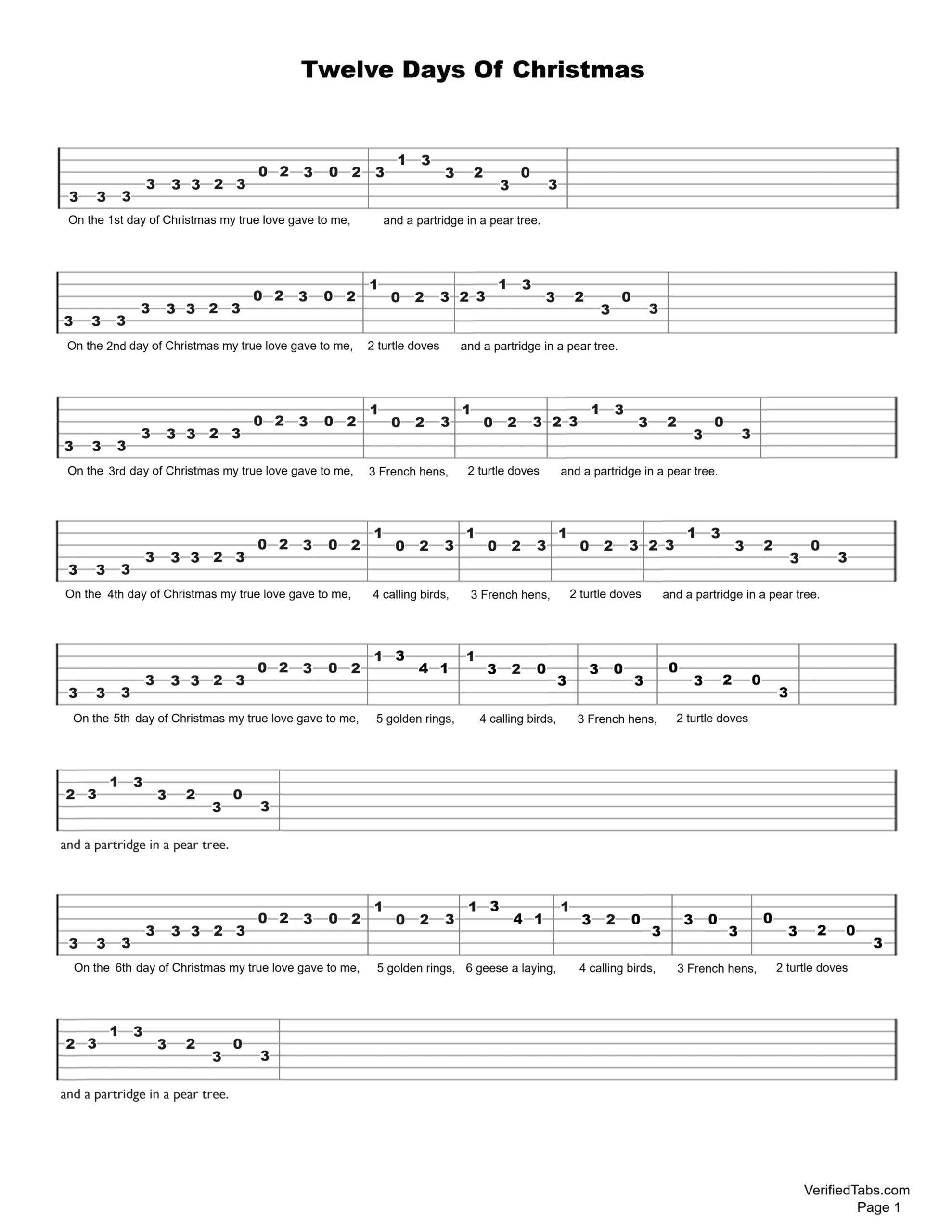 How to play Twelve Days of Christmas guitar tab by Frederic Austin with lyrics. Browse more from Christmas Songs or Popular Songs.